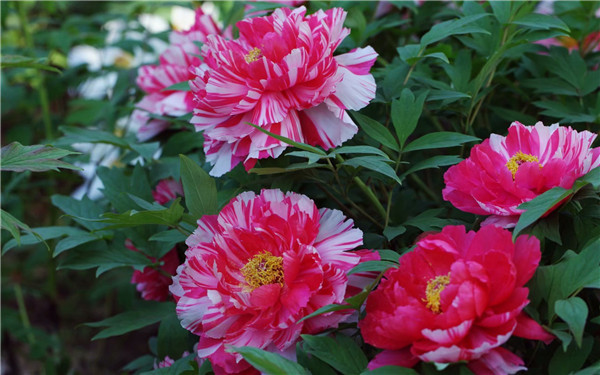 日本牡丹“岛锦”一花双色,花朵红白相间,或是红色花瓣中间长着白丝,或是如玉白色打底,粉红色丝线点缀在花瓣中间,为少见的复色牡丹。日本寒牡丹‘寒樱狮子’两季开花,冬季初放,春季再现,是非常难得的两季开花牡丹。如果没有赶上第一波儿,这一波儿花期一定不要错过。