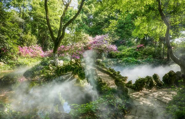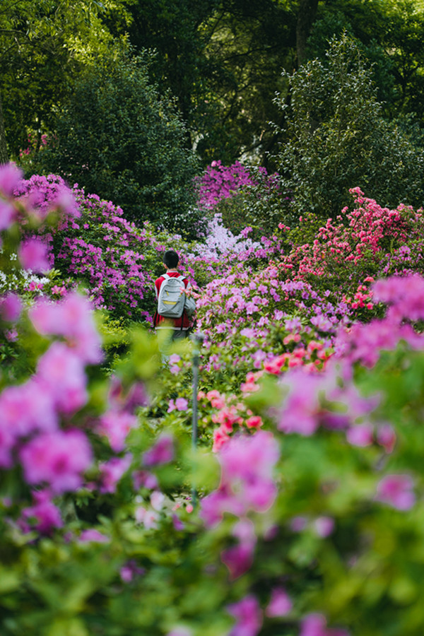 杜鹃园依据坡地变化参差错落地种植亚高山类杜鹃,在都市中复刻了野生杜鹃的生长环境。杜鹃花多生长在山地疏灌丛或松林下,在市区,这种来源于亚高山地带的杜鹃并不多见。杜鹃园内林深景幽、小径蜿蜒、繁花似锦,漫步其中,怡然自得。园内杜鹃已漫山遍野怒放开来,红、粉、白、紫、绿多个颜色的杜鹃将山林浸染得色彩斑斓。杜鹃园一旁的水云涧拥有人造雾喷和涌泉,飘忽不定的雾霭在花丛林隙间弥漫,营造出迷雾笼罩的林涧意境,映衬着周围红艳艳的杜鹃,宛如人间仙境。一旁涌泉的潺潺流水更是先声夺人,吸引人入山中揽胜。
