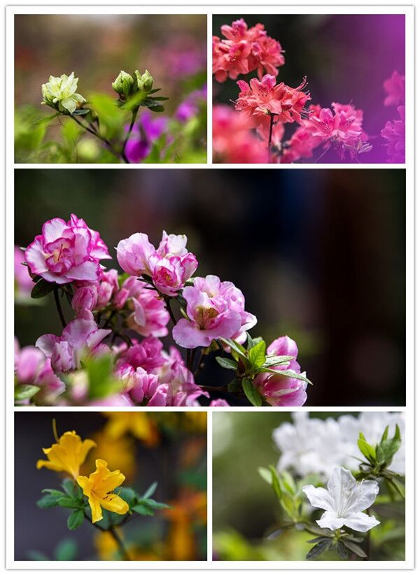 杜鹃花色艳丽,武汉植物园的杜鹃除红色、紫色、粉色、白色等单色外,还有绿色杜鹃和复色杜鹃花。从国外引进的绿色杜鹃品种‘绿色光辉’,花朵小巧玲珑,色如碧玉,十分罕见。复色杜鹃‘皇冠’花朵白粉相间,粉红色镶边,素雅又不失颜色,一扫杜鹃的艳丽姿态,既清新又迷人。