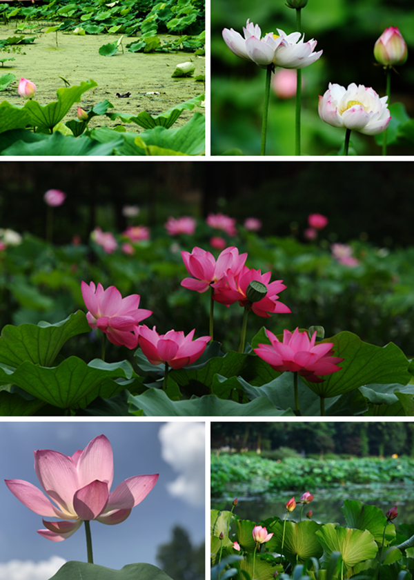 武汉植物园荷花展示区由荷花品种栽植区和自然式荷花群落区组成,展示了各色荷花的形态特征和群落景象,是集水生湿地景观展示、种质资源保存为一体的综合型展区。