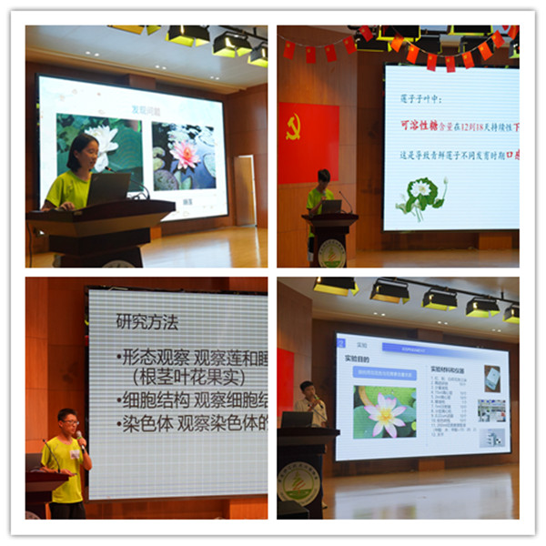 针对莲和睡莲容易被公众混淆的现象,湖北仙桃队从地理分布、生物学形态特征、生长习性、分子生物学分类等不同层面探究了两个物种的区别。“荷花为什么这样红?”通过花青素的提取与鉴定,湖北天门队论证了花青素影响荷花颜色的科学假设。湖北武汉队通过生物碱组分和含量研究的方式探究了“最苦不过莲子心”的原因。长阳队在实验探究中重新认识了植物种子里的“老寿星”——莲子,破解了沉睡千年的莲子也可以“复活”的秘密。各队伍分别从研究背景、实验设计、实验过程、实验结果与分析、总结与展望等几个方面讲述了这几天科学探究的经过。在探究过程中,学生们掌握了科学的探究方法,以及多种实验室操作技能,对科学研究也有了更深入的了解。