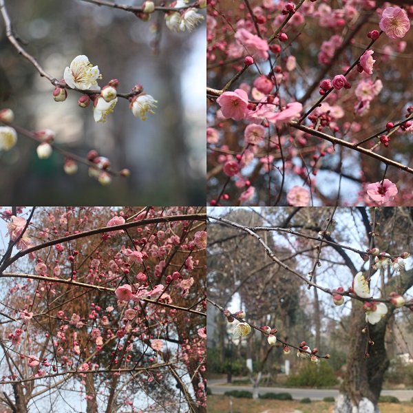 武汉植物园全园种植梅花80多株,主要分布在小梅园。这里既有果梅也有花梅,还有花果兼用的梅品种。果梅的花多单瓣,花梅的花型较多,有复瓣、重瓣、台阁型等。
