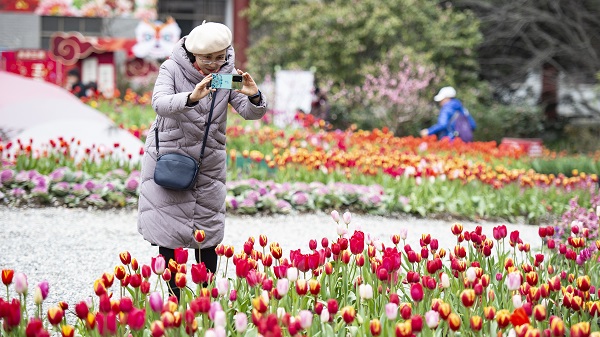走进武汉植物园,从入口处到温室沿途一路芬芳,郁金香、桃花、热带兰、牡丹、山茶各种花卉次第开放,春花竞放笑脸迎宾,节日氛围浓郁。游客边观赏边拍照,心情大好。他们在繁花中尽情拥抱春天,感受节日的喜庆氛围。