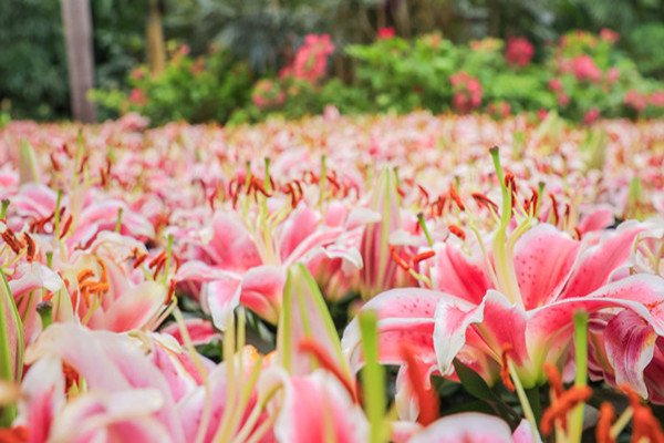 今年国庆,武汉植物园举行“赴百合之约 · 享鲜花生活 ”百合花展,展出亚洲百合、东方百合等类别的30多个品种,展示了丰富的百合品种资源。“伊莎贝拉”“火星之恋”等复瓣品种,花朵层叠繁复,给人华丽之感,“嘉兰百合”颜色红红火火,开花时如燃烧的火焰一样热烈。“眼线百合”的花瓣边缘描着流畅的“眼线”,花心周围的斑点就像可爱的小雀斑。百花的很多品种以香味馥郁著称,此次展出的香水百合、“黄天霸”等品种香气醉人,整个展览区域花香四溢,让人充满幸福感。8000支百合色彩丰富、形态各异,红、黄、白、粉、橙各色百合将节日妆点得热烈浪漫。温室橱窗为百合的品种展示区,集中展示了百合的优异品种。