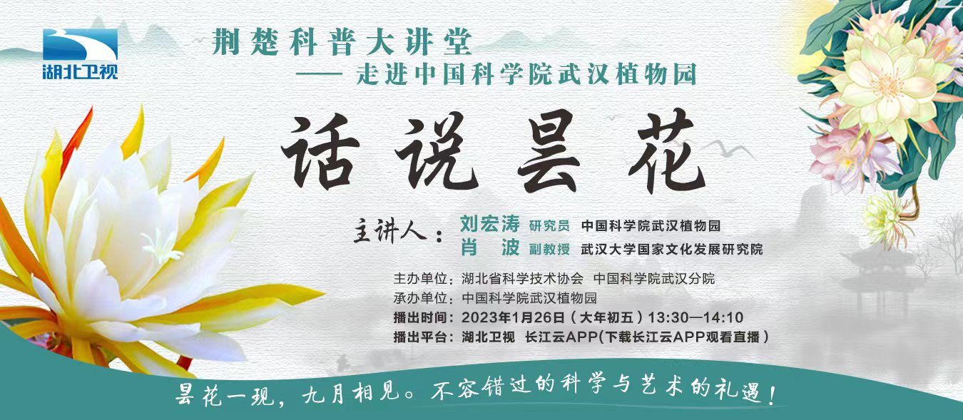 1月26日(大年初五)13:30-14:10,中国科学院武汉植物园刘宏涛研究员、武汉大学国家文化发展研究院肖波副教授做客“荆楚科普大讲堂——走进中国科学院武汉植物园”,共话昙花,开启一场奇幻的思想碰撞之旅。节目将在湖北卫视、长江云APP播出。