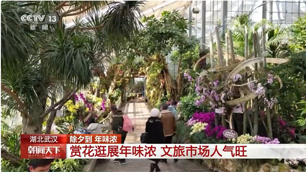 “湖北武汉:赏花逛展年味浓 文旅市场人气旺”,除夕当天,央视《朝闻天下》栏目将镜头聚焦到武汉植物园。新闻提到,“春节期间,湖北武汉各景区文化场馆内,赏花逛展等100多种活动热闹非凡。在武汉植物园内,群芳竞开,花香四溢春意浓,一年一度的热带兰展更是吸引眼球。此外,今年武汉植物园还引进了2500株牡丹,打造了中国风沉浸式牡丹展览,园艺师通过花期调控让市民提前两个月欣赏到牡丹花开,烘托出新春佳节的热闹氛围。”
