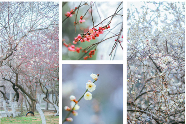 武汉植物园全园种植梅花80多株,主要分布在小梅园。这里既有果梅也有花梅,还有花果兼用的梅品种。果梅的花多单瓣,花梅的花型较多,有复瓣、重瓣、台阁型等。目前开放的梅花约三成,过一段时间,朱砂梅、垂枝梅也将接棒开放。晴日梅花分外妖娆,雨中赏梅也颇有意境。