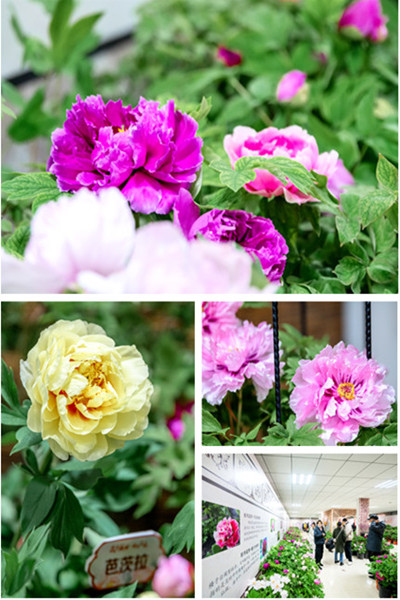 在新春牡丹展厅,白、粉、红、紫、蓝、绿、黄等九色牡丹花团锦簇,极尽绚丽,仿佛搬来了满园春色。牡丹展已经开幕了近一个月,经过几批上新,1500株牡丹正值盛花期,40多个品种全部开放。最富盛名的黄牡丹‘巴茨拉’拥有一半牡丹一半芍药的血统,是公认最美的伊藤杂种牡丹,具有极高的观赏价值和经济价值。它的叶子和茎似芍药,花型和香味似牡丹,花为橙黄色,蕊中心为翠绿色,还具备几分青柠檬香气。另一种黄牡丹‘黄冠’花瓣大而纤薄,颜色为柔和的黄色。两种黄牡丹各具特色。‘岛锦’和‘二乔’红粉相间,丰腴婀娜,是复色牡丹的精品。花展还引进了来自荷兰的经典芍药品种‘莎拉·伯恩哈特’,它被称为“全球最流行的芍药”,花朵为重瓣碗状,未开时玫瑰红色的花苞圆润可爱,盛开时重重叠叠的粉色花朵浪漫婉约,是十分流行的切花品种。 此外,近日还新增了正红色的‘旭港’、白色的‘白王狮子’等牡丹品种。