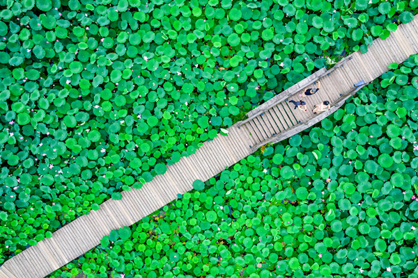荷花展示区内荷叶田田,与周围悬铃木、千屈菜、王莲、芦苇相互映衬,形成丰富的景观层次。小桥剪水,莲塘泛舟,木栈道穿梭而过,俨然一幅雅致的水墨江南景观图,一派“天人合一,物我交融”之生境。如今满园荷花盛放,接天莲叶无穷碧,层层叠叠让人惊艳。