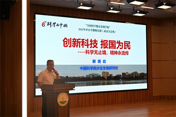 培训伊始,中国科学院水生生物研究所研究员,党委书记、副所长解绶启讲授“创新科技,报国为民——科学无止境 精神永流传”的主题报告。解绶启研究员深入学习贯彻习近平总书记在科学家座谈会上的讲话精神,围绕《关于进一步弘扬科学家精神加强作风和学风建设的意见》展开报告,重点讲解了爱国精神、创新精神、求实精神、奉献精神、协同精神和育人精神等六大科学家精神。两弹一星”元勋邓稼先、中国应用光学开拓者龚祖同、中国萃取剂化学之父袁承业、海洋科学开拓者曾呈奎、中国近现代生物学奠基人秉志、原生动物学奠基人王家楫……他们排除万难立志报国,勇立潮头争做创新主力军,实事求是求真务实,不断发现真理、验证真理、发展真理,在实现民族复兴的伟大征程中奉献自我、奖掖后学。一位位科学家的光辉事迹如雷贯耳,响彻报告厅,令在座教师倍感动容,多位教师代表上台交流学习心得。
