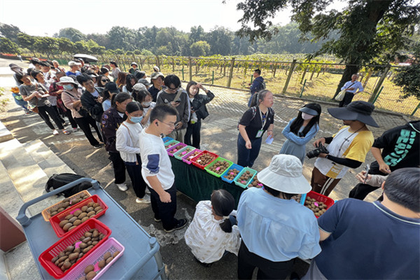 武汉植物园国家猕猴桃种质资源圃是全球最大、品种和基因型最丰富的猕猴桃资源保育和科研基地。东湖论坛期间,武汉植物园陆续开展了三场国家猕猴桃种质资源圃开放活动,吸引了洪山区企业人才单位代表及高校人才代表、武汉市光谷第二初级中学师生、自发报名的社会公众等300多人参加。在武汉植物园猕猴桃资源与育种学科组工程师张鹏的带领下,公众走进国家猕猴桃种质资源圃零距离探秘猕猴桃的“奇异家族”,感受我国猕猴桃丰富的遗传资源。武汉植物园还邀请公众担任猕猴桃风味品鉴官,试吃10多种武汉植物园自主选育的优良猕猴桃品种,并从香味浓烈程度、酸甜度、质地软硬度等指标进行打分,为后期猕猴桃育种和市场化提供借鉴。