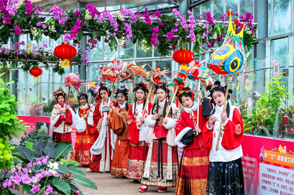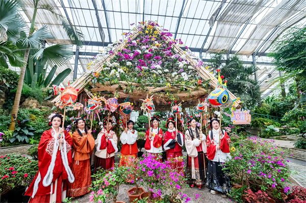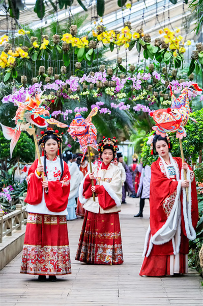 当天,武汉植物园还为游客免费提供了十多套汉服。游客们束发盘髻,佩簪花,执团扇,在武汉植物园姹紫嫣红的花卉中感受春色如许,以古韵今风庆新春,浸润传统文化之美。
