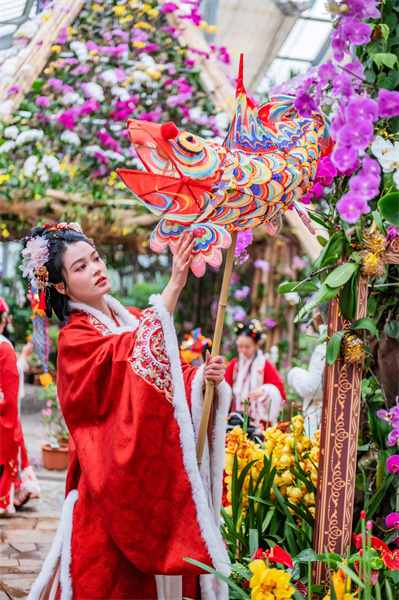 当天上午,来自武汉归梦廊汉服社的8位汉服爱好者身着传统服饰,手持鱼灯巡游。他们时而上下翻飞、时而蜿蜒徐行,手腕灵活转动,让鱼灯宛如真鱼在水中自由穿梭。“鲤鱼摆尾”、“双鱼争食”、“鲤鱼戏水”、“鱼跃龙门”,持灯人摆出各种阵型,吸引了众多游客围观,感受传统民俗文化。从景区入口到景观温室,汉服爱好者衣袂翩跹、环佩叮当,手中的鱼灯轻拂过桃花,又在兰花丛中流连,将国潮与古风的浪漫演绎到底。