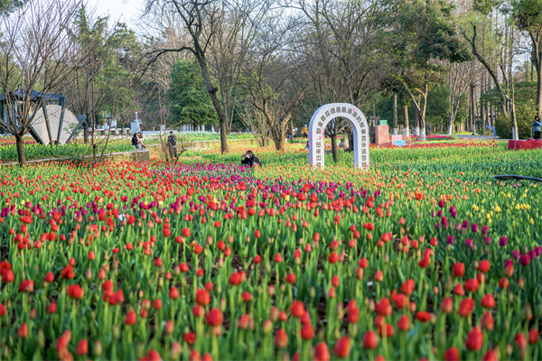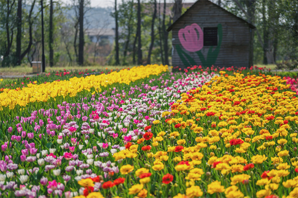 武汉植物园以现有生态景观为依托,结合地势地形和生境特点,打造郁金香平地景观、林地景观、水系景观。五个展区各具特色,共同展示郁金香的色彩美、艺术美、环境美。湖岸带花田郁金香享受阳光慷慨,最先开得灿烂。这里的郁金香根据不同花色分带状种植,赤橙黄绿青蓝紫,20多条彩带如织锦般绣出七彩花毯。风吹树动、流水潺潺,姿态柔美、色彩绚丽的郁金香和周边美景共筑成灵动的滨水景观。菊花圃大量使用红、橙、黄等暖色系的郁金香,给人明亮温暖的观赏感受。郁金香结合狭长的地块构造出流水、浪花和帆船的图案,微风吹过,色彩翻涌、跳跃,流淌成绵延不绝的花海。入口林下,郁金香配置多种球根花卉,以吉祥的龙纹作为设计元素,形成“祥龙踏春”的花卉景观。密林展区,郁金香搭配花葱、美丽月见草、白晶菊等花卉辅材,结合蜿蜒的赏花步道打造花卉迷宫。游人穿行其中,乐趣融融。中央花境大道大胆着墨,以黄、蓝对比色的郁金香为主色调,白色、粉色郁金香点缀其中,碰撞出鲜明的视觉冲击力。国风浓郁的园林景观与郁金香交相辉映,绘就古典与现代交织的画卷。