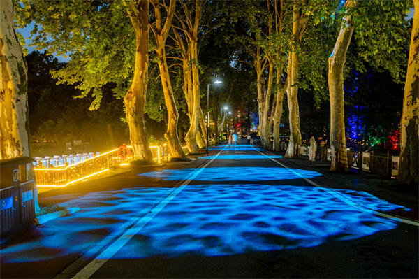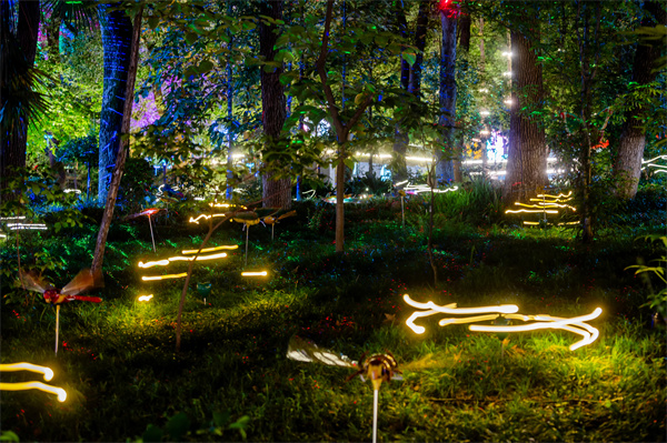 生态和科技融合,夜自然在光影交织下焕发新的活力,暮观景、夜赏花亮点多多。入口小鹿迎宾,以“树深时见鹿”的意境,开启夏夜森林梦境的奇妙篇章。奇幻丛林里萤火虫灯、水母灯、光纤灯星星点点,云雾缥缈萤火璀璨。樟树大道上,蓝色感应花灯搭配水雾,形成清凉观花通道。沉水植物区的水下“森林”披上炫彩光影,波光明净,鱼跃虾潜,开启全新暮色体验。被霓虹灯牌与灯带妆点的荷花睡莲观赏区,国风小景的巧妙融入更添雅韵,水雾弥漫,月色溶溶,共绘出一幅荷塘月色的缥缈画卷。荷岸边的梧桐大道在光影流转间,地面绘就朵朵莲花,可以沉浸式体验“步步生花”的美妙。