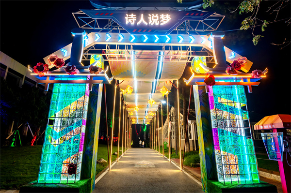叹惊鸿盛景,遇绝美洛神。夜游复刻《洛神赋》等文学作品中的经典意境,营造了“洛水花神”、“洛水秘境”、“游龙梦境”、“诗人说梦”等景观,一朝步入画卷,一瞬梦回千年。震撼洛神花灯高12米,洛神轻启双眸,顾盼生姿,“远而望之,皎若太阳升朝霞;迫而察之,灼若芙蕖出渌波。”,复现洛神的风姿。洛神花灯附近,游龙盘旋,流光溢彩。“鸿雁长飞光不度,鱼龙潜跃水成文。”,缤纷炫彩的游龙花灯以回旋之姿,游走在明亮的立柱上。洛水河畔,神女翩翩,婉转轻歌,如诗如画。只见洛神、河伯临水而立,游鱼嬉戏、荷灯摇曳、水雾袅袅,仿佛在述说着流传千年的洛神故事。临水步道上,蓝色水纹灯投射出碧波荡漾的光影,观者宛若“水上游”。