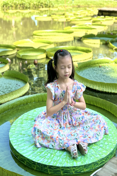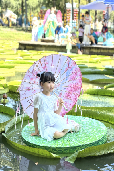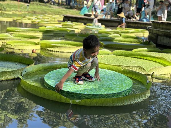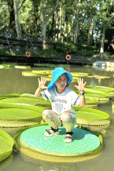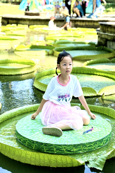 此次活动选择了长势更好的克鲁兹王莲来当做“轻舟”,通过评估和前期的测试,活动要求35公斤以下的小朋友参与,以保证活动的安全性。萌娃坐王莲前,工作人员准备了一个直径1米的轻盈泡沫板,以平衡叶片的受力范围,分散王莲的压力。在工作人员的协助下,小朋友们从水中栈道登上王莲这座特殊的小舟,萌娃们在王莲叶片上或坐或站,开心地摆出各种姿势。参与活动的家长不忘给萌娃拍照,留下难忘时刻。