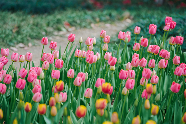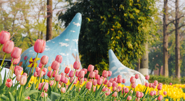 作为本届花展的核心特色,今年的郁金香花展一改往日的色彩浓烈叙事,多采用低饱和度的马卡龙色系郁金香诠释春日美学。花展以奶油白、雾粉、浅橙、淡黄等柔和又明亮的色调,铺陈出如诗如画的春日梦境。菊圃作为主展区,以阶梯式色带、流动花毯与艺术装置,将球根花卉的温柔美学推向极致。精选雾粉色的‘柔道’、橙色的‘羞涩阿波罗’、奶油白‘哈库’、明黄色的‘黄水晶’等品种,以开阔的地块为画布,依托阶梯式地形铺陈出蜿蜒跌宕的变化色阶。低饱和色块如颜料倾泻而下,宛若色彩流动的盛宴。游客驻足其间,恍若踏进梦幻甜美的马卡龙花园,俯仰皆成画中人。菊圃附近林下空间则以红、粉、紫、橙等色的郁金香打造“定格春天”主题花毯,暖色系的郁金香与樟树、朴树等高大乔木的深绿背景形成冷暖碰撞,砾石小径穿行其间,游客可于碎片化色块中捕捉明暗交织的油画质感。