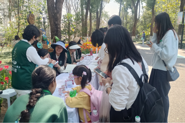 同时,“我给春天添色彩”的活动也受到了热烈欢迎。科普老师提供了各种装饰材料,游客们利用毛绒线球、多彩布块等,一起为大树穿上了多巴胺“新衣”,给春天添上了独特的色彩。完成创作的大树以有趣的模样博得了很多孩子的喜爱,特意与其合影留念,来往好不热闹。