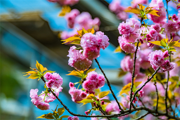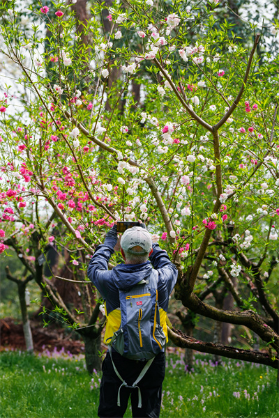 桃花园至野果园沿线,桃花、海棠、晚樱正演绎着春日浪漫。‘菊花桃’的花瓣似一条条批针,与菊花十分相似。‘红白花桃’为重瓣桃花,红白相间的花色如少女般娇羞。‘满天红’则以密集簇拥的花枝呈现红霞漫天的视觉盛宴。桃花园附近还有十几株晚樱簇拥绽放,如粉色云团,形成绯云压枝的樱花大道。