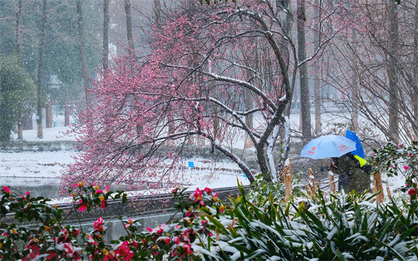 雪中赏梅,为一大雅事。在武汉植物园小梅园,怒放的朱砂梅、宫粉梅、江梅被白雪压枝,更显清绝风骨。虬劲的枝干上,积雪勾勒出遒劲的线条,而点点红梅、粉梅缀满枝头,不与雪争色,只以清雅示人。粉瓣凝晶,薄透如玉,与枝头莹雪相映成画。虬枝横斜,雪映嫣红,疏影暗香自成一景。细雪纷飞中,游客或驻足细赏,或举起手机记录这难得一见的“雪压梅枝”之美。