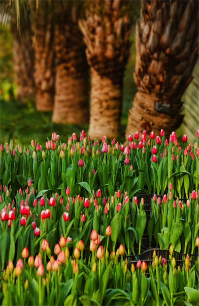 走进武汉植物园,工作人员正紧锣密鼓地布置郁金香花展。红色印记、小黑人、荷兰构思、神秘范依克、纯金等11个品种的郁金香以暖色系为主,明艳的红色、亮丽的黄色与粉嫩的色彩交织,宛如打翻的调色盘,为冬日增添融融春意。目前,大部分郁金香已显色,它们将集中装点中心花坛、景观温室门口及园区主干道,形成一片灿若云霞的花海。