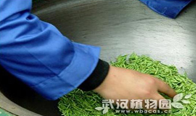 杀青:采好的茶叶尖放入炒锅中,慢火翻炒。通过锅炒高温破坏和钝化鲜叶中的氧化酶活性,抑制鲜叶中的茶多酚等的酶促氧化,蒸发鲜叶部分水分,使茶叶变软,便于揉捻成形,同时散发青臭味,促进良好香气的形成。将采好的茶叶尖放入炒锅中,慢火翻炒。