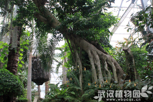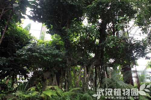 由于温室面积有限,这里的“独木成林”只是一种展示。其实,在真正的热带雨林中,大榕树的树冠可以达到几千甚至上万平方米,犹如一片茂密的“森林”,甚至可以容纳一支几千人的军队在树下躲避骄阳,让人不禁感慨大自然是如此神奇!