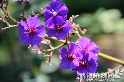 银毛野牡丹(Tibouchina aspera var. asperrima)是野牡丹科蒂牡花属的常绿灌木,原产巴西。茎秆是四棱形。对生在茎秆上的叶子也比较有特点,叶子上面密布着银白色的绒毛,看起来毛茸茸的,很有质感。圆锥形的花序上密生着花朵,5片花瓣平展的伸开,中间吐出细细的花蕊。花期为5-7月。