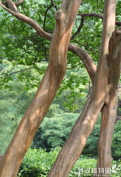 除了美丽的花朵,紫薇的一个显著特点是具有光滑的树干。年轻的紫薇树干,年年生表皮,又年年自行脱落,使树干显得新鲜而光滑;成年的紫薇树,树身的表皮都已脱去,看上去光溜溜的,据说光滑的连猴子也爬不上去呢,所以紫薇还被叫做“猴刺脱”。