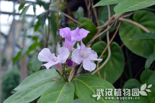 这个季节的花儿比较少了,不过步入武汉植物园的景观温室,有一种植物格外引人注目,它正怒放着花朵,像一个个的小铃铛,深深浅浅的紫色花朵分布在蜿蜒的藤子上,给人一种浪漫的气息,看起来高雅而别致,这种植物叫蒜香藤。