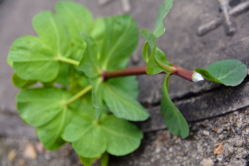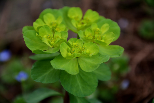 在植物园的小径旁,当你低头在一堆三叶草中找寻幸运的四叶草或是在木凳上歇息时,你一定会见到它的身影,尤其在猕猴桃园的路两侧,干燥适宜的环境让它成群疯长,如一把绿油油的小伞,遍地四散,叶形像汤匙,边缘如锯齿,它就是大戟科泽漆属的泽漆,伞梗向上伸出五枝叶状的苞片,与茎叶相似,如五个杯状的云朵一样聚在顶端,故又称五朵云。仔细观察它的雄花,你会发现一个肾形的腺体。全国除了新疆,西藏,几乎都是它的栖居之所,尤其在荒野山沟和山坡路旁。
