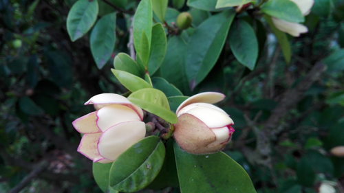 你看,前方是一株盛开的含笑花。轻轻靠近,一股甜香袭来,深吸几口气,仿佛要醉在这空气里。含笑花的叶子是倒卵状的,密密地生在树上。躲在枝叶间的就是我们的含笑花。你瞧,有的花上还有着佛焰苞状的苞片,像害羞的小姑娘挑开了窗帘向外张望。有的苞片已经脱落了,6片象牙色的花瓣开而不放,正似笑而不语的少女。而且,每片花瓣的边缘还涂着精致的紫色唇彩。