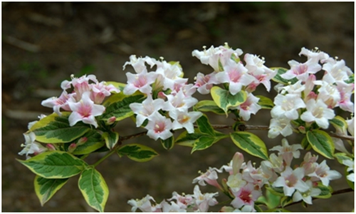 花叶锦带花Weigela florida ‘Variegata’。叶缘乳黄色或白色,花期5月上旬,聚伞花序生于枝顶,花色由白逐渐变为粉红色,由于花开放时间不同,有白、有红,使整个植株同时呈现两色花,格外绚丽多彩。