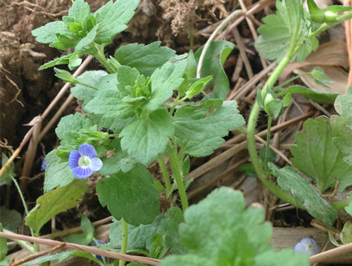 婆婆纳是一种常见的野花,每当春暖花开时,在一些不起眼田边地角,丛丛簇簇地开着,花冠为淡蓝色,有4枚花瓣,花瓣上带蓝色条纹。婆婆纳是入侵植物,对农作物有一定的危害。