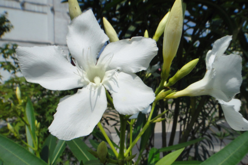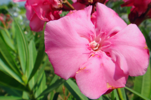 “布叶疏疑竹,分花嫩似桃。”此乃夹竹桃美名的由来,因其长达半年以上的花期,故得一别名——“半年红”。她隶属于夹竹桃科夹竹桃属,常绿直立大灌木,原产于地中海沿岸及亚洲的热带、亚热带地区,现在我国南北各地广泛种植。虽不是本土植物,但自15世纪的引入也使她拥有500多年的历史了呢!夏初尹始,充足的阳光,湿润的土壤是她孕育的温床,你常可在路旁或园林之中觅得她的踪迹。