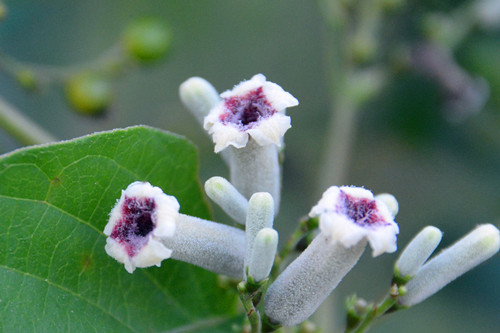 植物园的傍晚,晚风轻轻拂过荷塘的尽头,激起丝丝涟漪。荷也告别游人的嬉戏,悄悄地合上了瓣,静静地听夏夜的蛙啼蝉鸣。不远处,零星的游人还在循着小径,是希望在落日前再寻些新的惊喜吧!落日的余晖,撒向温室旁的栅栏,一朵朵开着红白两色的杯状小花密密麻麻缠绕在弯曲的茎藤上,阳光下显得小巧可爱。俯身轻嗅,是一股淡淡的味儿,可当你扯下一片绿叶,使劲揉搓后,一股浓烈的鸡屎的气味便在空气中弥散开来,这就是今天的主角,味如“鸡屎”,得一诨名——鸡屎藤,味如其名,形象贴切。
