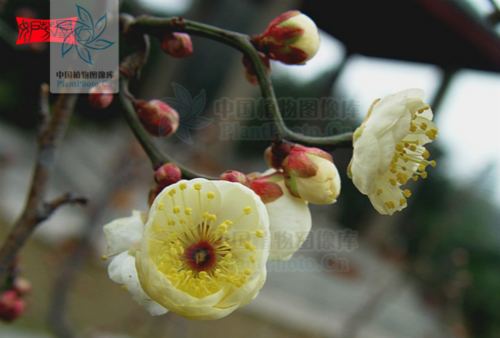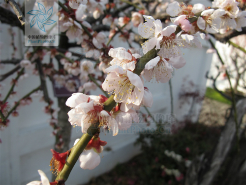 玉蝶型梅花俗称为玉蝶梅,其花瓣为白色,复瓣或重瓣,萼绛紫色。在蕾期,有时花蕾尖端呈浅红色,但盛开时花色变白。