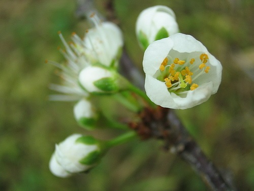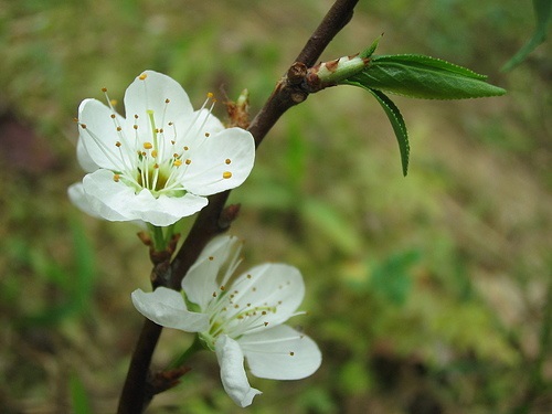 梨《广群芳谱》说:“梨树似杏,高二三丈,叶亦似杏,微厚而硬,色青,光腻有细齿,老则见斑点。二月间开白花,如雪六出。”每次看到梨花都想到雪,岑参“忽如一夜春风来,千树万树梨花开”则将白雪比作梨花,虽反喻,却也突出了梨花最大的特点,花白色。而白色花瓣中紫红色的花蕊也成了梨花独一无二的代表。当然,身为苹果亚科植物,2-5个柱头也是其区分于李亚科种的重要标志。