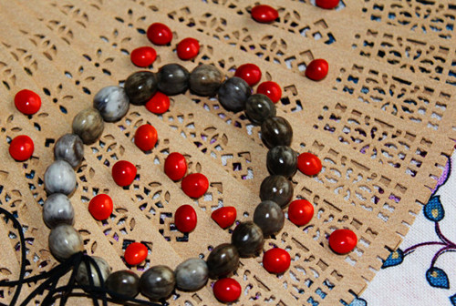 另外,薏苡的工艺价值也不可忽视,其茎叶可造纸,总苞可制美工用品,如:手串、项链等。不过值得一提的是,常用来做手串的薏苡(Coix lacryma-jobi )其实是薏苡属下的另一种植物,这种薏苡总苞坚硬,美观,按压不破,有白、灰、蓝紫等颜色,有光泽而平滑,中间有孔,容易穿线成串,工艺价值比较大。但它的果小,质硬,淀粉少,因此不能食用。