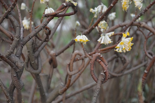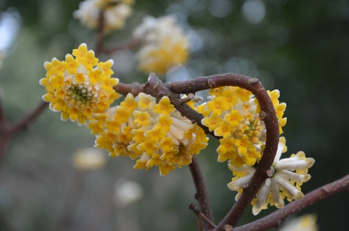 正是乍暖还寒时候,黄昏时漫步于花境大道,感受着这一刻的宁静美好。各色梅花争奇斗艳,不时有香气扑面而来。行至花园餐厅附近,一阵浓香来袭,竟不是梅花熟悉的味道。寻香至一株灌木前,一簇簇像绣球却比绣球小的明黄色的花,毛茸茸的挂在枝头,甚是可爱。粗壮的褐色小枝竟裸露在外面,没有一片遮羞的叶子。更神奇的是,这么粗壮的小枝竟然打了一个又一个结,初看时还以为是园艺工人为了造景人为打的结,直到看到它的名字:结香,才明白这是一个心灵手巧的“植物匠人”。