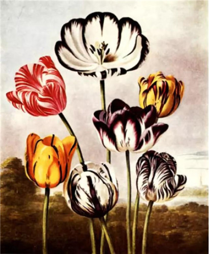 后来人们才发现那些受人追捧的郁金香品种花瓣上的绚丽图案来自病毒感染,这种病毒叫做郁金香碎色病毒(Tulip breaking virus),由蚜虫传播。虽然它给花瓣带来美丽的花纹,但也会使植株种球退化。