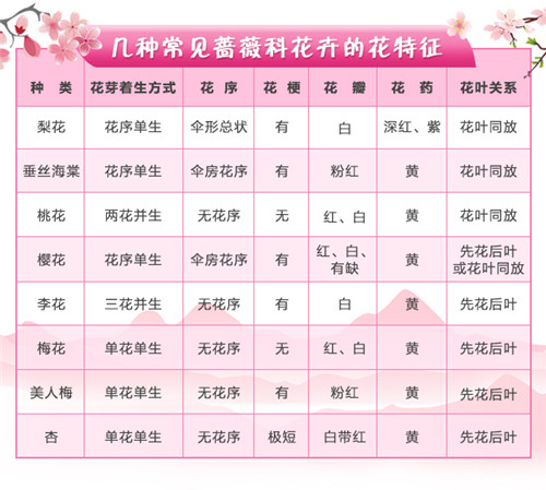 蔷薇科花卉多在3-4月份开放,但是不同的花开花初始时间还是有差异,按照开花的早晚顺序依次是梅花、桃花、紫叶李、樱花、垂丝海棠、梨花等。 因为不同品种的花期会有差异,整个花期也会有重叠,这个只能是辅助参考的方法。