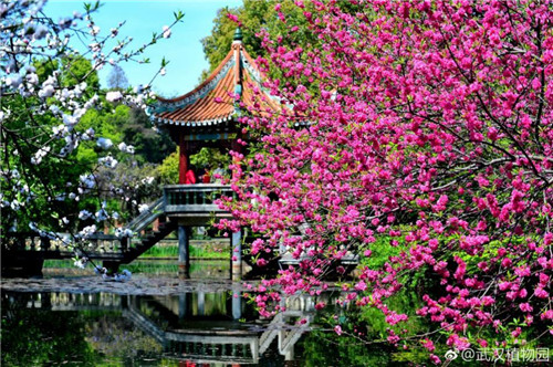 在武汉植物园芙蕖亭有着经典的桃花一景,一红一白的桃花左右掩映着小亭,流水潺潺中,花影亭姿突现,有着柳暗花明之感,让人犹如遁入桃源,每年都吸引着无数摄影师的镜头。