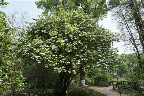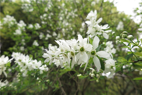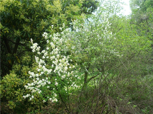 白花开满树枝,在这深深浅浅的绿色背景衬托下,清丽脱俗。
