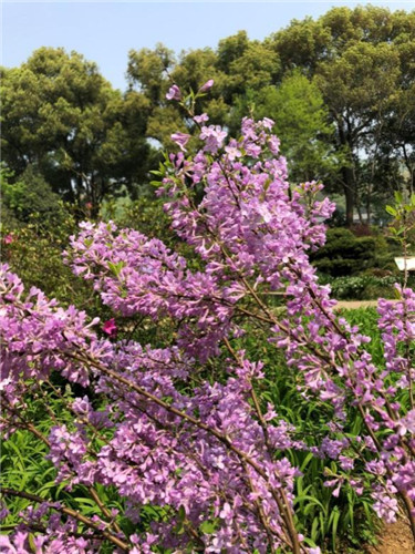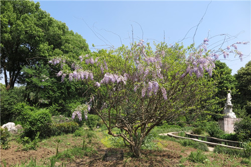 落叶藤本紫藤一路攀援落叶灌木紫薇向上,二者经多年生长,再难分彼此,只年年修剪紫藤,令其占据头顶一片天空,于春天悬垂串串紫穗。