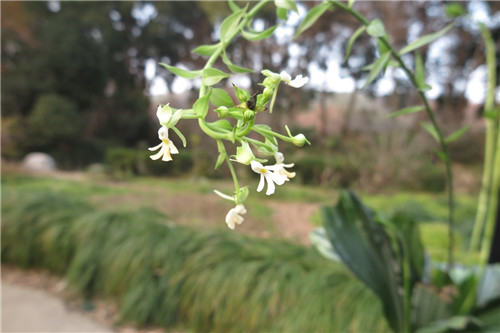 银带虾脊兰Calanthe argenteostriata C. Z. Tang & S. J. Cheng具有长长的花葶,质地柔软,常弯曲;其唇瓣洁白,3裂,中间裂片深2裂,如同白衣飘飘的仙子,尾部具有黄绿色的距。