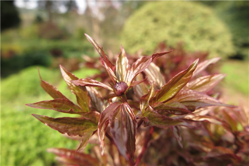 芍药Paeonia lactiflora Pall.从现蕾到开花,约需一个月,期间,叶片从紫红色过渡到绿紫色,直至绿色。