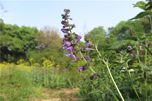 丹参Salvia miltiorrhiza Bunge具有肥厚的肉质根,其外表朱红色,故名“丹参”。丹参花大,紫色,二唇形,是典型的唇形科植物花的形态。
