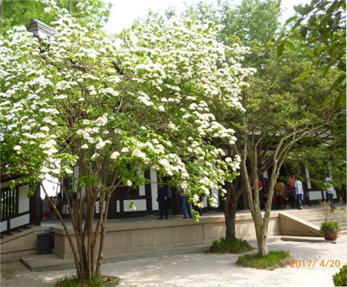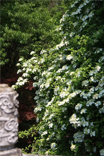 琼花也可植于坡地、水边、建筑旁及与园林小品相结合。如扬州琼花观、大月寺等地的琼花景色,或与水相映成趣,或与塔遥遥相望,大家不仅可以赏美景,还能听趣闻,绝对让人回味无穷、流连忘返。